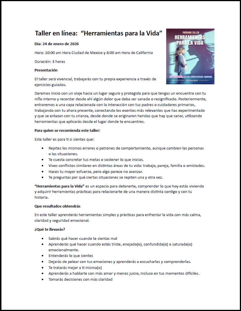 Taller en línea “Herramientas para la vida” Taller en línea denominado “Herramientas para la vida” sanando heridas, el próximo 24 de enero de 10:00 a 13:00 hrs. 2026