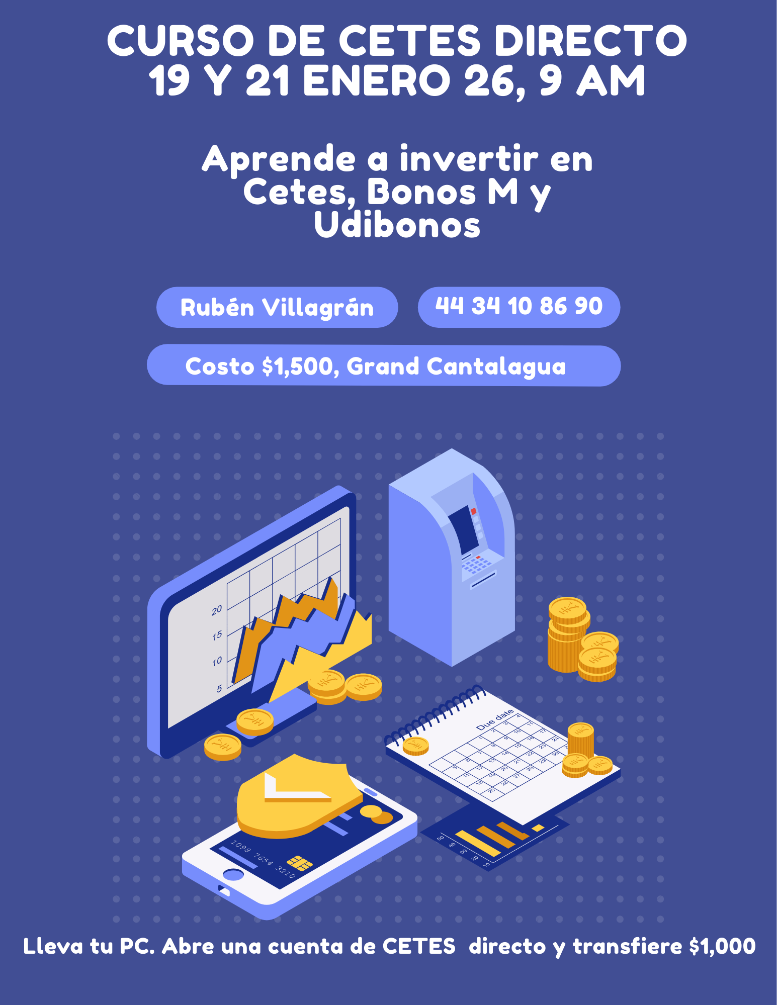 Aprende a Invertir en Cetes, Bonos M y UdibonosEstimados amigos de Morelia, les invito a participar en el curso de Cetes Directo, para aprender a realizar inversiones personales redituables. Será en Cantalagua, donde siempre son los desayunos. Cada quien paga su desayuno, costo $1,500 2026