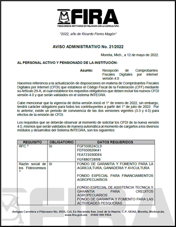 Aviso Administrativo número 21 de 2022Recepción de Comprobantes Fiscales Digitales por internet versión 4.0 2022