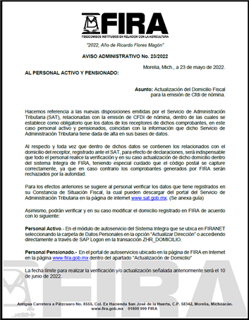 Aviso Administrativo número 23 de 2022Actualización del Domicilio Fiscal para la emisión de CFDI de nómina 2022