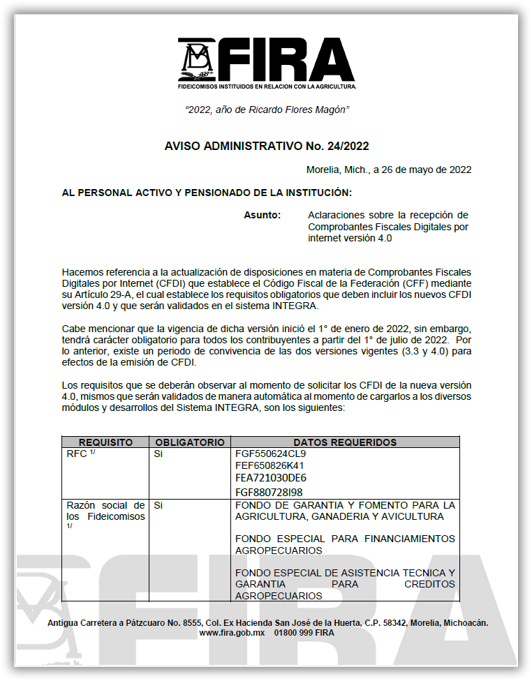Aviso Administrativo número 24 de 2022Aclaraciones sobre la recepción de Comprobantes Fiscales Digitales por internet versión 4.0 2022
