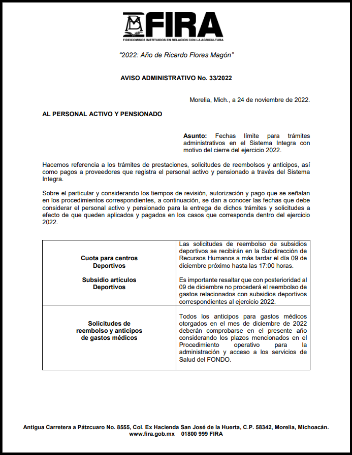 Aviso Administrativo 33/2022Fechas límite para trámites administrativos en el Sistema Integra con motivo del cierre del ejercicio 2022 2022
