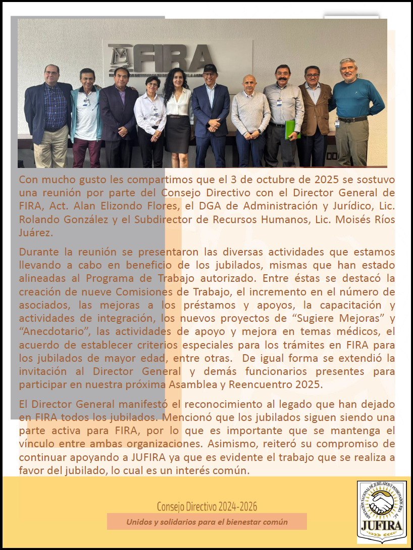 Con mucho gusto les compartimos que el 3 de octubre de 2025 se sostuvo una reunión por parte del Consejo Directivo con el Director General de FIRA, Act. Alan Elizondo Flores, el DGA de Administración y Jurídico, Lic. Rolando González y el Subdirector de Recursos Humanos, Lic. Moisés Ríos Juárez.