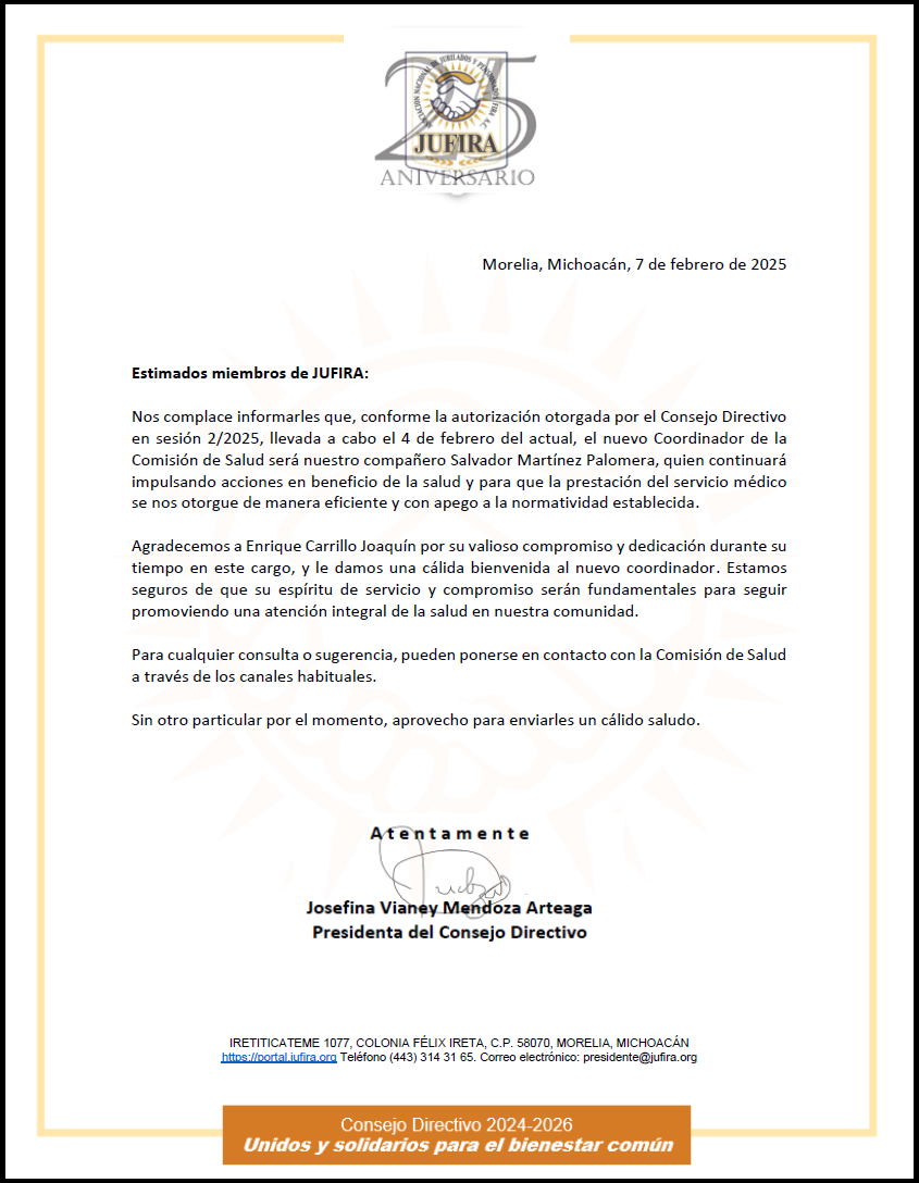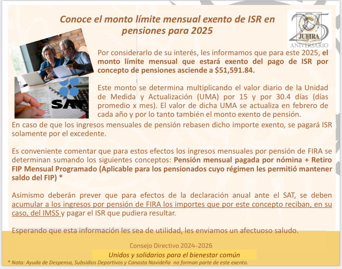 Incremento general pensiones 4.439% De: Ma. del Rocio Huaracha Garcia <rhuaracha@fira.gob.mx>Date: mar, 14 ene 2025 a la(s) 8:54 p.m.Subject: Incremento pensiones del 4.439%To: Josefina Vianey Mendoza Arteaga <josefina.vianey@gmail.com>Cc: José Jaime Gutiérrez Guerrero <jjgutierrez2009@hotmail.com>, Eligio Esquivez <eligioeg@gmail.com>, Claudia Susana Renteria Zamora <crenteria@fira.gob.mx>, Moises Rios Juarez <mrios@fira.gob.mx> Buenas noches, Les informo que en la primera quincena de enero de 2025, […]