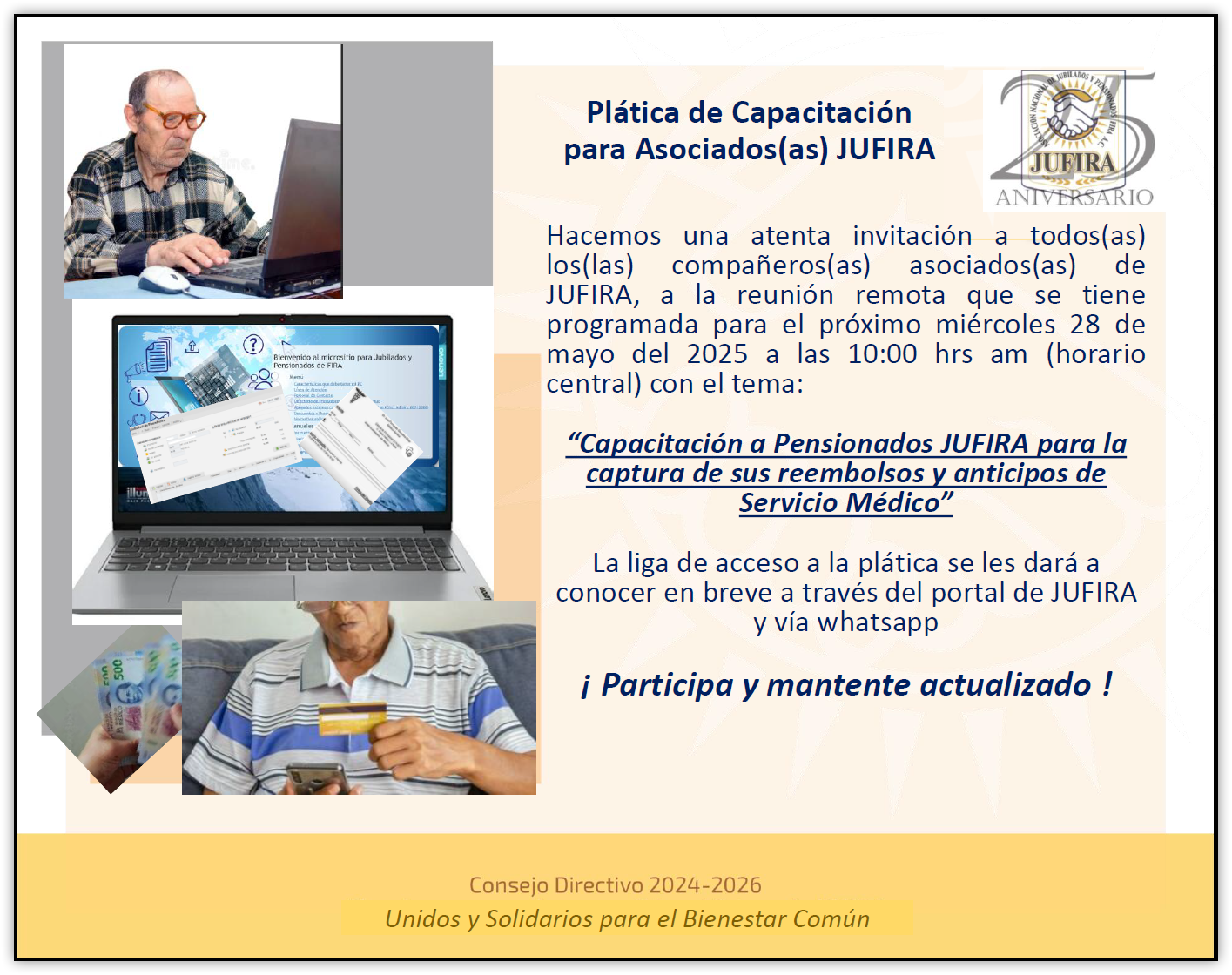 Plática de Capacitación para Asociados(as) JUFIRACapacitación a Pensionados JUFIRA para la captura de sus reembolsos y anticipos de Servicio Médico. 2025