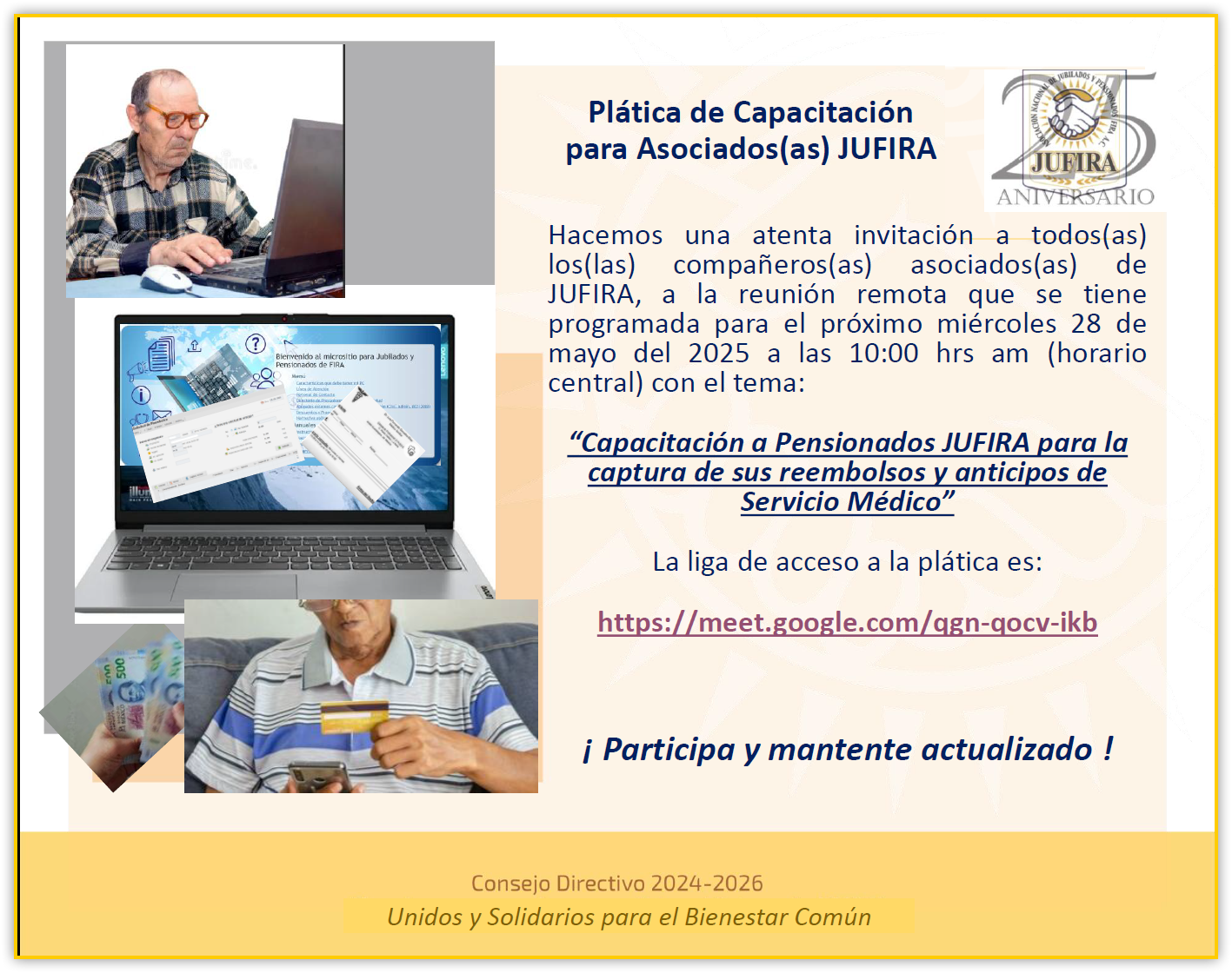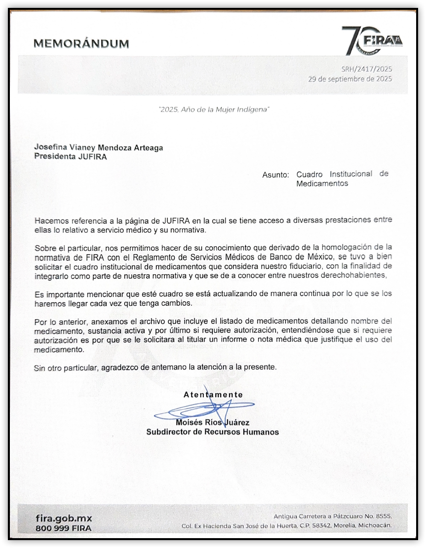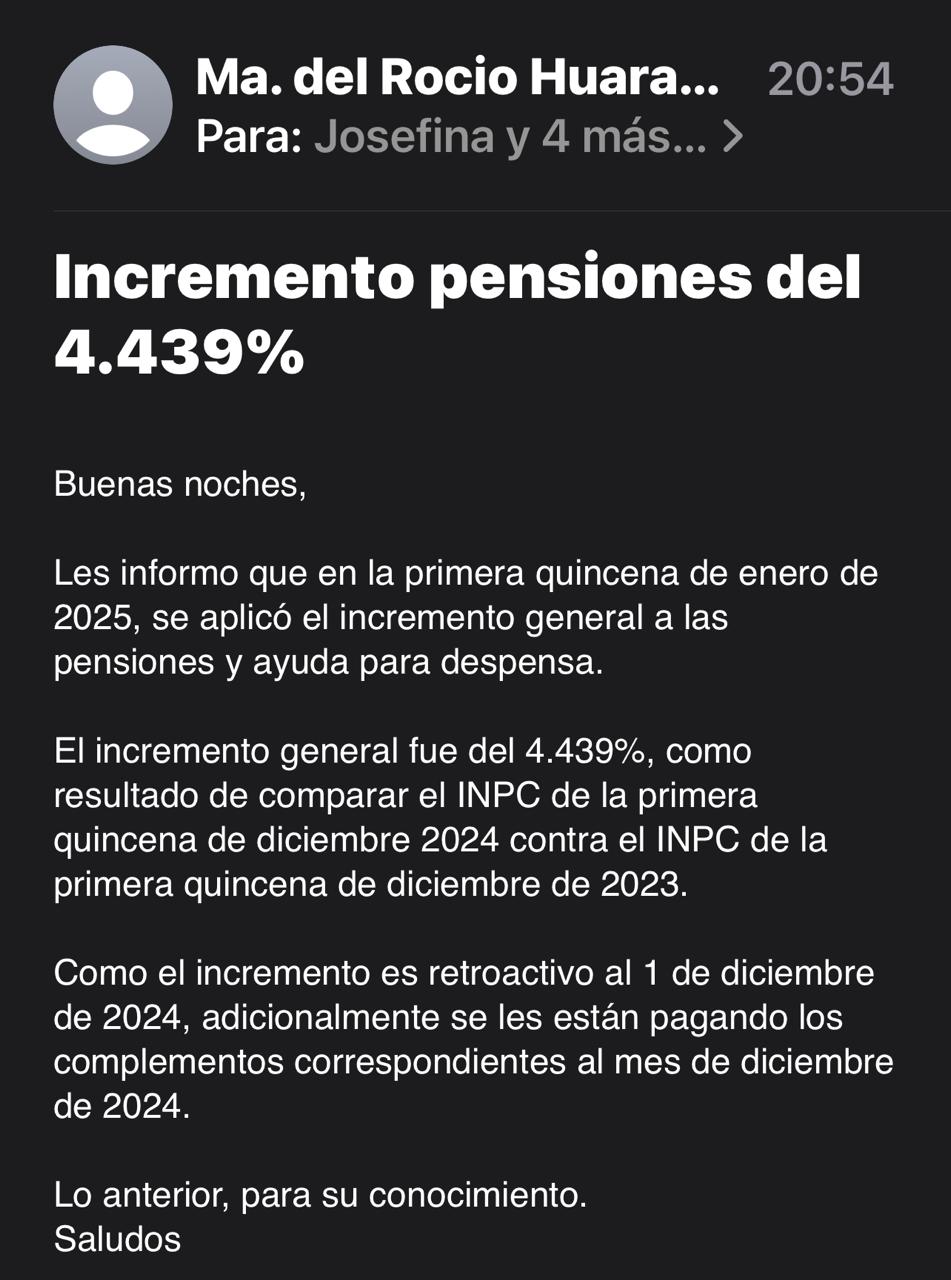 Incremento general pensiones 4.439% De: Ma. del Rocio Huaracha Garcia <rhuaracha@fira.gob.mx>Date: mar, 14 ene 2025 a la(s) 8:54 p.m.Subject: Incremento pensiones del 4.439%To: Josefina Vianey Mendoza Arteaga <josefina.vianey@gmail.com>Cc: José Jaime Gutiérrez Guerrero <jjgutierrez2009@hotmail.com>, Eligio Esquivez <eligioeg@gmail.com>, Claudia Susana Renteria Zamora <crenteria@fira.gob.mx>, Moises Rios Juarez <mrios@fira.gob.mx> Buenas noches, Les informo que en la primera quincena de enero de 2025, […]