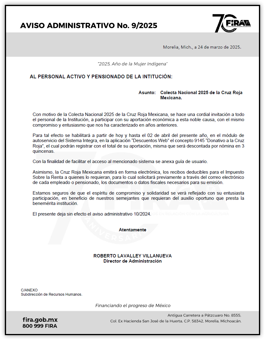 Emisión de Aviso Administrativo 9/2025: “Colecta Nacional 2025 de la Cruz Roja Mexicana”.