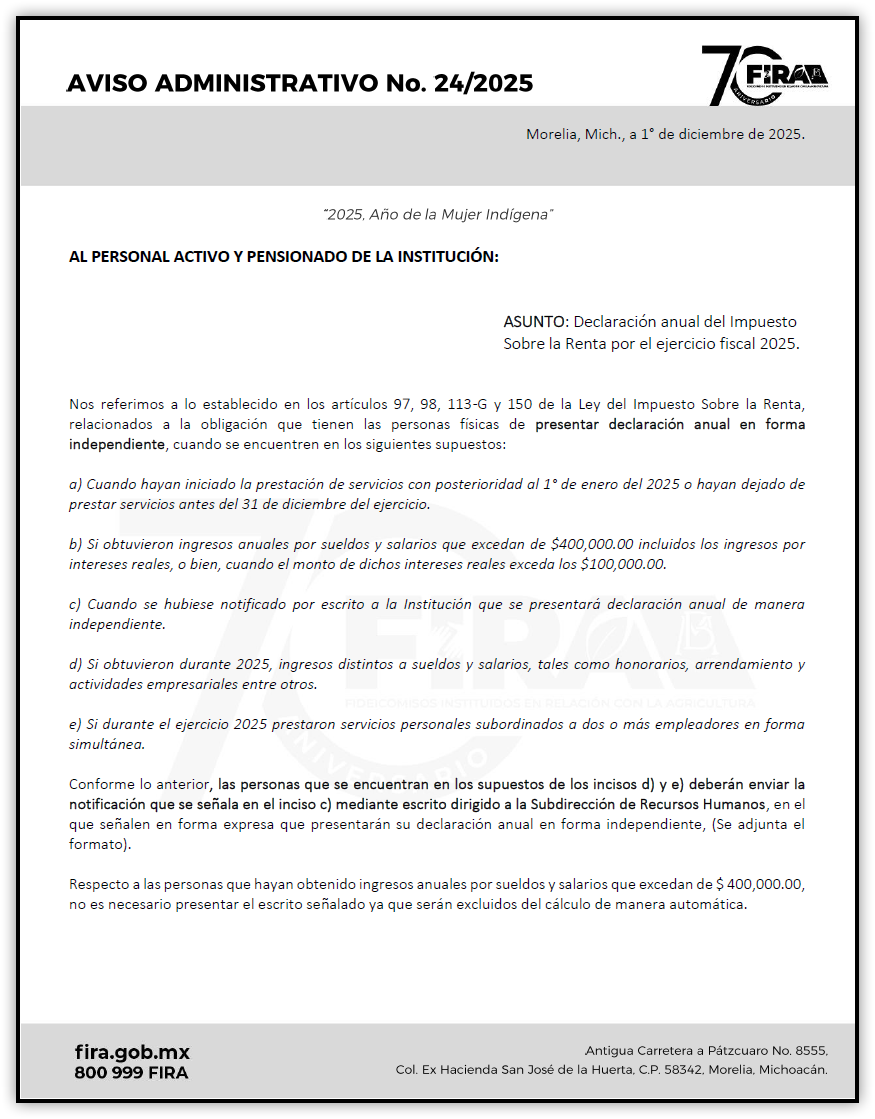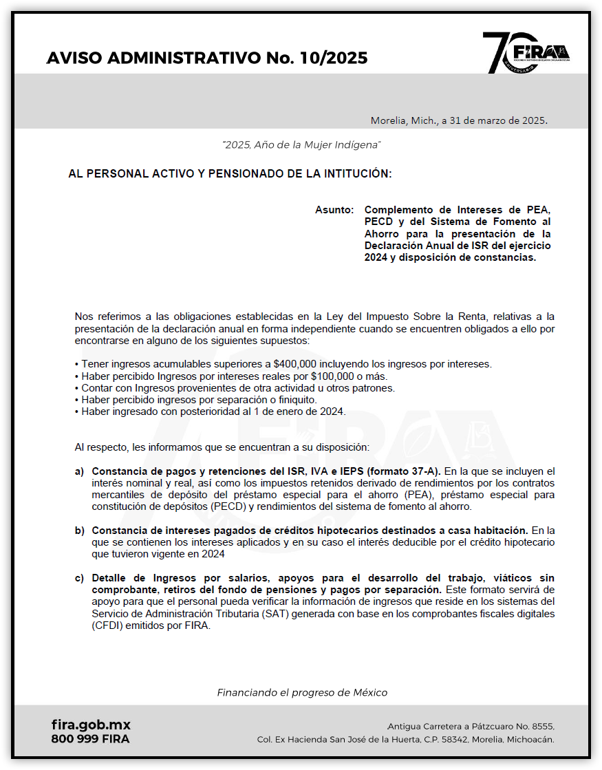 Se informa que el día 31 de marzo de 2025 se ha dado de alta el Aviso Administrativo número 10 de 2025, referente al “Complemento de Intereses de PEA, PECD y del Sistema de Fomento al Ahorro para la presentación de la Declaración Anual de ISR del ejercicio 2024 y disposición de constancias” presentado por la Subdirección de Recursos Humanos y autorizado por la Dirección de Administración.