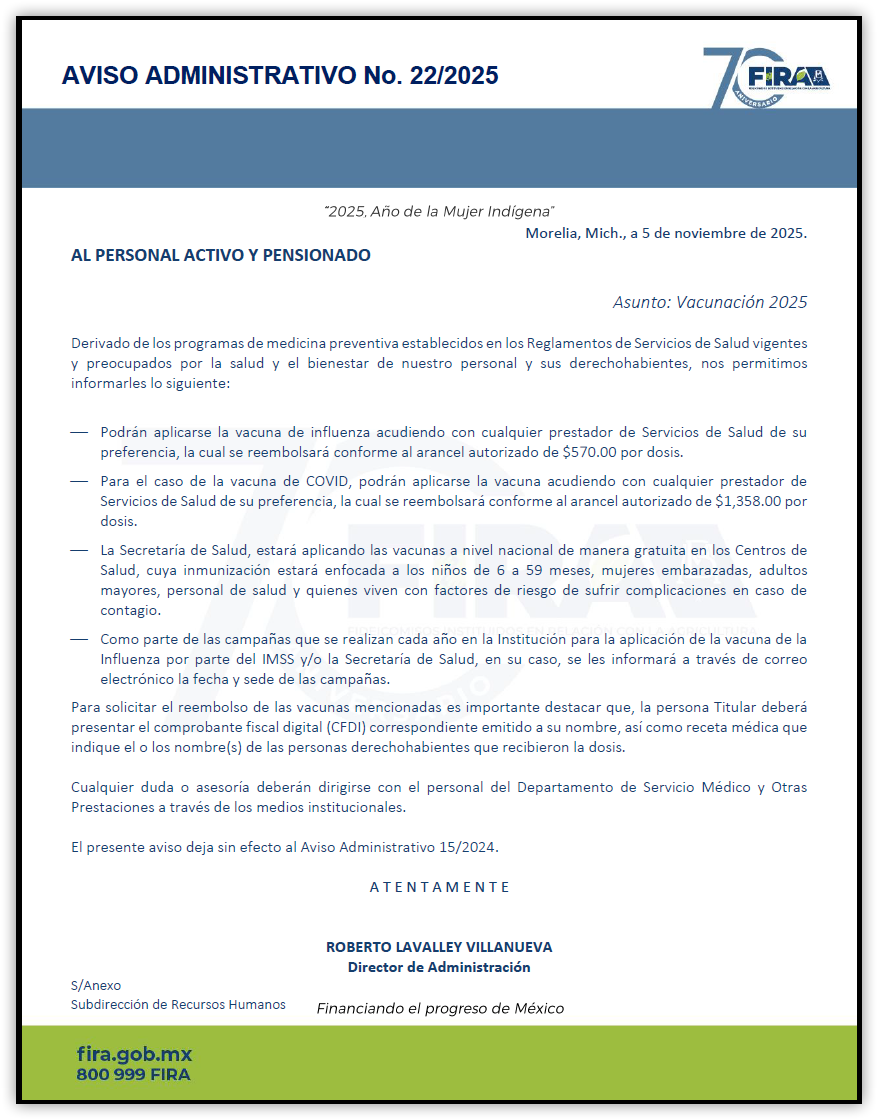 Aviso Administrativo 22/2025: “Vacunación 2025”.