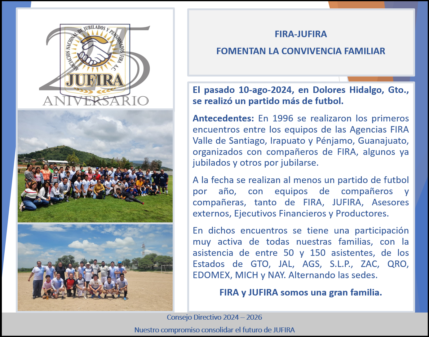 FIRA-JUFIRA FOMENTAN LA CONVIVENCIA FAMILIAREl pasado 10-ago-2024, en Dolores Hidalgo, Gto., se realizó un partido más de futbol. 2024